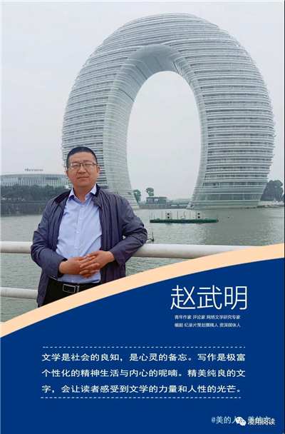 趙武明,曾用筆名丹心、牧星等。金城文化名家、青年作家、評論家、網(wǎng)絡(luò)文學(xué)研究專家、編劇、紀(jì)錄片策劃撰稿人、資深媒體人。中國散文學(xué)會(huì)會(huì)員、中華散文網(wǎng)創(chuàng)作委員會(huì)副主席、甘肅省網(wǎng)絡(luò)作協(xié)副主席,甘肅省八駿文藝人才研究會(huì)副秘書長兼文學(xué)委員會(huì)主任等,曾在魯迅文學(xué)院中青年作家班學(xué)習(xí)。在多家報(bào)刊雜志網(wǎng)絡(luò)開設(shè)專欄。發(fā)表各類文學(xué)作品數(shù)百萬字,曾獲國內(nèi)外多項(xiàng)文學(xué)大獎(jiǎng)及新聞獎(jiǎng),擔(dān)任國內(nèi)多項(xiàng)文學(xué)大賽評委。唯美散文作家代表。部分作品被選入各種文集,并被設(shè)計(jì)成中高考閱讀試題。
