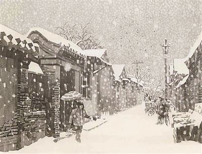 休息日,大雪天,況晗背著畫具出門作畫。濕式水彩畫,講究水色淋漓,是用排筆將清水洇濕畫紙然后作畫。一幅寫生未成,畫筆已然結(jié)冰。況晗的家鄉(xiāng)氣候濕潤(rùn),墻縫里面生的是青苔。北京的氣候干燥,墻縫里面積存的是數(shù)百年的塵土。家鄉(xiāng)村野的色調(diào)是青綠,京城胡同的色調(diào)是灰白,于是況晗改用寬線條鉛筆畫來(lái)寫意胡同。