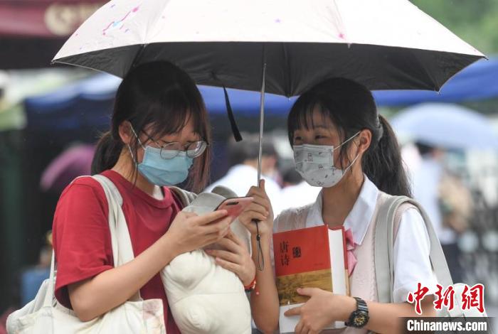 浙江高考結束首日,在杭州學軍中學門口,考生抱著復習資料準備回家?!⊥鮿偂z