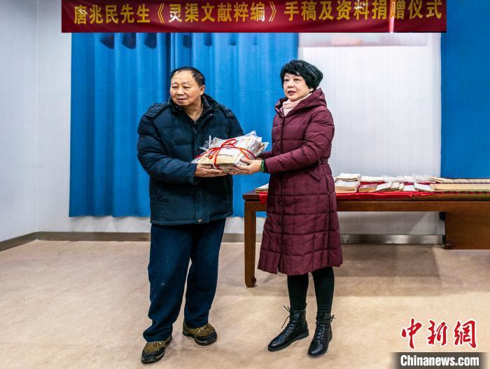 “卅載青燈知苦樂,一篇黃卷薈磯珠。”捐贈現(xiàn)場,唐兆民兒子唐丁寧回憶其父親用四十年時(shí)間艱辛編撰《靈渠文獻(xiàn)粹編》出版后的感慨原話。