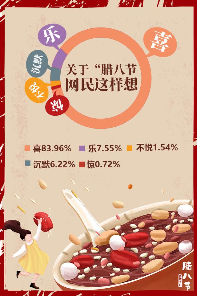 雖然今年多地的臘八節(jié)活動(dòng)因疫情而取消,但是人們對(duì)于團(tuán)圓、祥和、富裕、康寧、平安的期盼從未改變。有關(guān)“臘八”的網(wǎng)民情緒分布中,“喜”占83.96%,“樂(lè)”占7.55%??傮w來(lái)說(shuō),開心喜悅的情緒占到了九成以上。