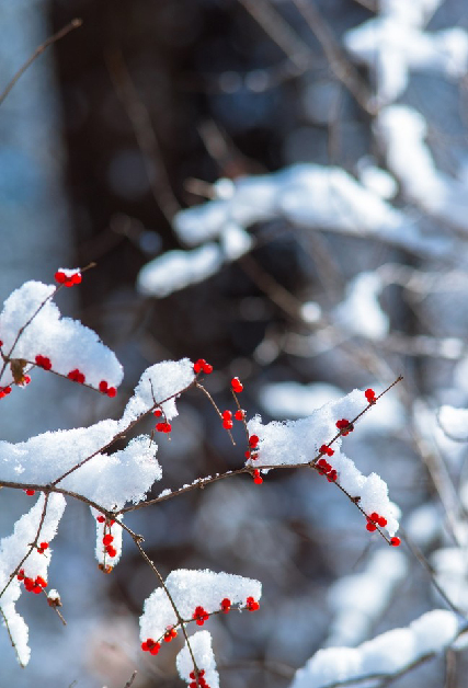 許多人走到這里,停下了腳步,被這雪后滿樹熱烈的紅色吸引。風在這個時刻,沒有了聲息,似乎是因為這一簇炫目的紅。天空是清澈透明的藍,空氣中彌漫著清冽的干枯植物的氣息,這氣息來自頂著雪花的干草、沉睡的樹木、滄桑的松柏、埋藏在雪下的紅隼的羽毛、雨燕干燥的糞便,以及鳥雀熱愛的金銀木酸甜可口的果實。