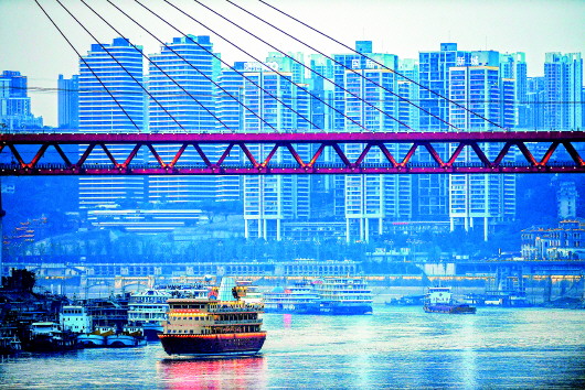 盡管長(zhǎng)江索道單向車(chē)程只有3分鐘,但游客眼里的風(fēng)景卻別有風(fēng)味。從北岸到南岸,雖說(shuō)穿行于鬧市,卻如同在兩山之間悠蕩。先是遠(yuǎn)處的高樓密密麻麻地盡收眼底,腳下的老建筑也歷歷在目。快到江邊時(shí),有一片黃墻灰瓦的古建筑格外醒目,這就是湖廣會(huì)館。緊接著,車(chē)廂開(kāi)始凌越長(zhǎng)江,腳下滾滾江水一路向東。江中有一座大橋,名曰東水門(mén)大橋,2014年3月建成,橋上汽車(chē)如過(guò)江之鯽,橋下軌道列車(chē)瀟灑穿行。接近南岸時(shí),風(fēng)情萬(wàn)種的南濱路一覽無(wú)余。此后,又是一段充滿懷舊味道的老建筑。當(dāng)你還沒(méi)來(lái)得及回味時(shí),鈴聲驟然響起——到站了。