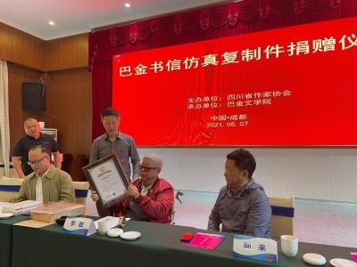 捐贈(zèng)儀式由四川省作協(xié)黨組書記侯志明主持,省作協(xié)主席阿來(lái)致辭。省作家協(xié)會(huì)向李致頒發(fā)了收藏證書。詩(shī)人黎陽(yáng)現(xiàn)場(chǎng)朗誦了巴金大哥寫給巴金一封信的選段,內(nèi)容充滿情感,令人動(dòng)容。朱丹楓、廖全京等文藝界人士,以及巴金多位親屬出席了捐贈(zèng)儀式。
