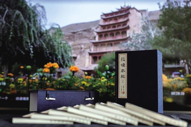 兩個(gè)月后,我如愿以償?!抖鼗捅炯o(jì)》繁體線裝本(限量版)出品,兩函,每函八冊(cè),總計(jì)十六冊(cè),繁體豎排,全手工裝訂。技藝之美,工序之繁,裝幀之考究,未之見(jiàn)過(guò)!當(dāng)我打開(kāi)拿到手上時(shí)肅然起敬,自然會(huì)靜下來(lái),恭恭敬敬翻閱,你能感受到甘肅豐富的歷史文化資源、厚重的文化積淀和波瀾壯闊的滄桑巨變。正是偉大的藝術(shù)和同樣偉大的宗教,在敦煌建筑了人類精神的輝煌莫高窟,人們生活在其中,才擁有現(xiàn)實(shí)人生意義的充實(shí)感和踏實(shí)感。