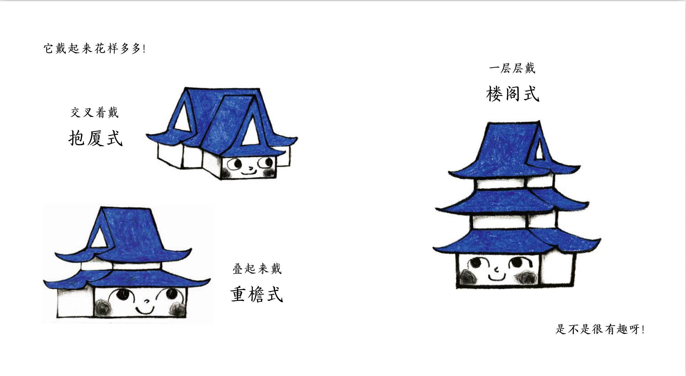 作者以真實的傳統(tǒng)建筑為原型,選取屋頂、鴟吻、窗欞、斗拱、瓦當和柱礎這六個頗有代表性的傳統(tǒng)建筑構件,讓他們自由地演繹自己的故事。比如,介紹屋頂時,想象成“給房子戴帽子”,不同的“帽子”有不同的名字,還有不同的戴法: