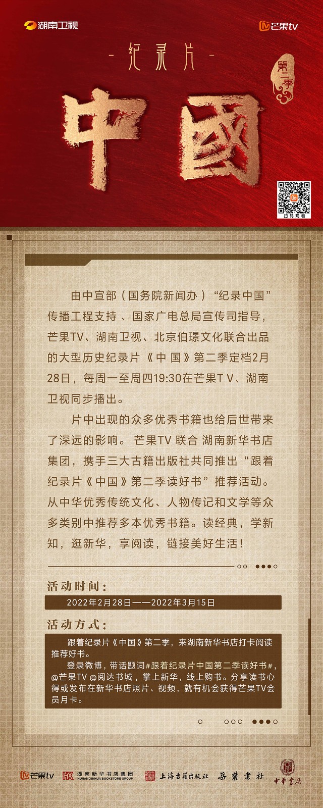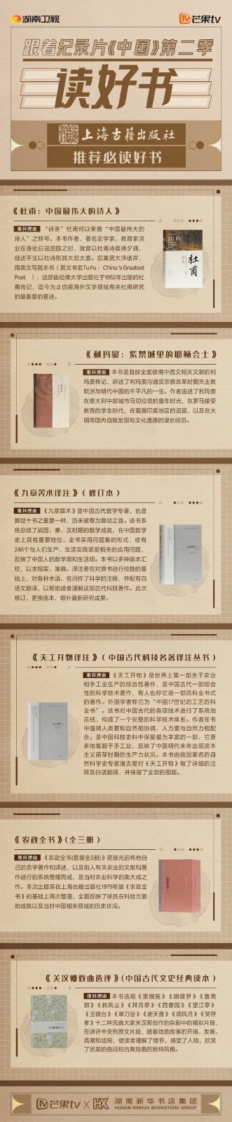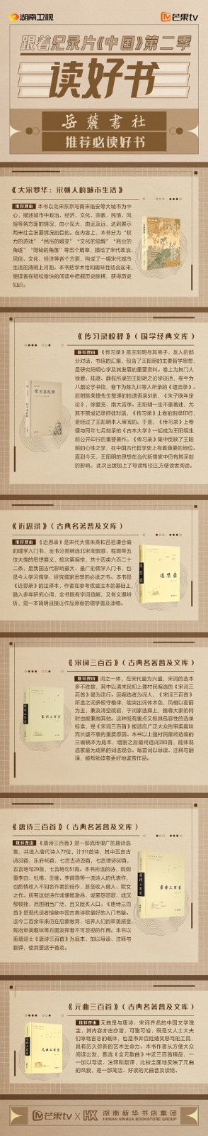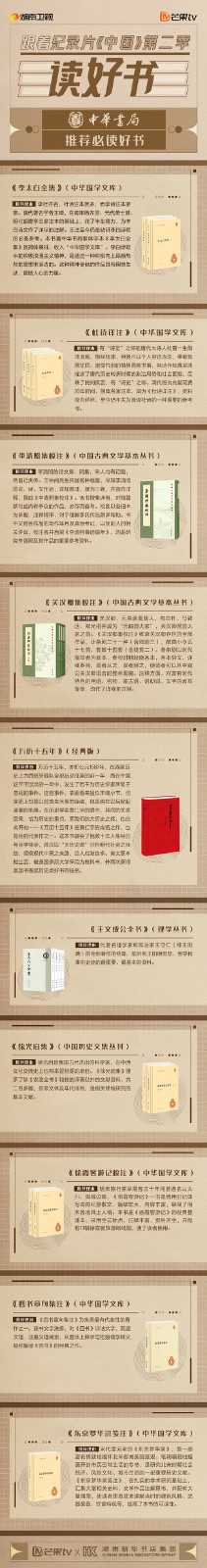 芒果TV以紀(jì)錄片《中國》第二季的精美品質(zhì),聯(lián)合湖南新華書店集團(tuán)的美譽口碑,將中華書局、上海古籍出版社、岳麓書社推薦的珍品好書,傾情向大眾推薦。本次“跟著紀(jì)錄片《中國》第二季讀好書”活動,將從2月28日持續(xù)到3月15日,湖南新華書店集團(tuán)旗下湖南圖書城、不吝Boolink書店、全省市級中心門店、長沙地區(qū)樂之書店等全員參與,推薦紀(jì)錄片《中國》第二季。書友及觀眾可登錄微博或到線下門店打卡參與活動。