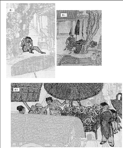 雖然沒(méi)有什么特別的社會(huì)意義、政治意義,或者其他宏大意義,但是對(duì)于個(gè)人來(lái)說(shuō),這個(gè)大叔卻喚醒了我們的某種情感,因此,讓我們與張擇端產(chǎn)生了情感共鳴。是怎樣的情感共鳴呢?請(qǐng)用心看圖,他裸露胳膊,衣著簡(jiǎn)單,是一個(gè)中年勞工形象,此時(shí)也許是午間,他可能只吃了簡(jiǎn)單的飯食(旁邊是飯館,他在飯館外的地上坐著,因此推測(cè)他沒(méi)有進(jìn)店消費(fèi)),甚至有可能他連午飯也沒(méi)舍得吃,只是坐在樹(shù)下歇會(huì)兒,然后就要開(kāi)始尋找下午的工作。只要我們用心去看他的樣子,就知道他是真的累了。為了讓讀者更加確信他是因?yàn)檎娴钠@鄱菹ⅲ恢幸膺€是無(wú)意,張擇端在大叔附近的遞鋪墻外畫(huà)了幾個(gè)睡覺(jué)的人,請(qǐng)看圖二。其中,有一個(gè)靠著大樹(shù)睡覺(jué)的士卒,他翹著腿,雙臂圍攏,也在睡覺(jué)。