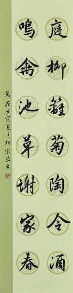 庭柳籬菊陶令酒,鳴禽池草謝家春。 釋文:庭前柳樹(shù),籬邊菊花,陶淵明飲酒于此,怡然自得;池塘里長(zhǎng)滿(mǎn)了春草,樹(shù)上的鳴鳥(niǎo)冬去春來(lái),謝靈運(yùn)因此寫(xiě)出了這樣的千載名句。韓宗岳(滿(mǎn)族)