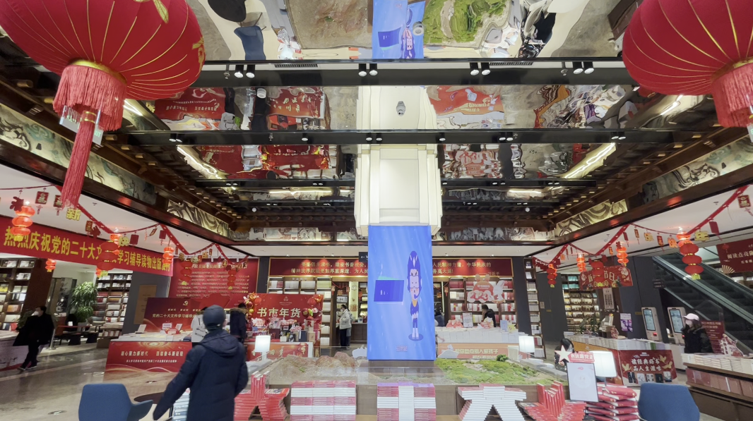 走進(jìn)甘肅省新華書店西北書城,這里裝扮一新,高高掛起的大紅燈籠烘托出濃濃的年味,敦煌文化元素的有機(jī)融入,讓中華優(yōu)秀傳統(tǒng)文化在這里流光溢彩。書城一樓的主題出版物展區(qū),勉勵(lì)人們熱愛讀書的標(biāo)語(yǔ)豁然醒目 。