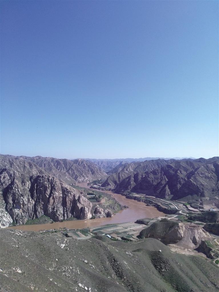 向西鳥瞰黃河,黃河幾乎直線撲面而來,河水發(fā)黃,流淌緩慢。過去這里,河水湍急,老遠就能聽到咆哮之聲。由于20世紀(jì)末,在下游20公里處建了小峽水庫,河水被抬升,河水流緩。黃河北面,依然是光禿禿的山巒。低頭看腳下的黃河,南岸的漢長城遺址清晰可見,旁邊有二三個人在農(nóng)田勞作。黃河流到此處,被腳下的九圪垯山迎面阻擋,折而向北,切開重重山巒,帶著野性,蜿蜒而去,一點兒也不留戀桑園子峽,不留戀九圪垯山,不留戀滄桑的大地和歲月。