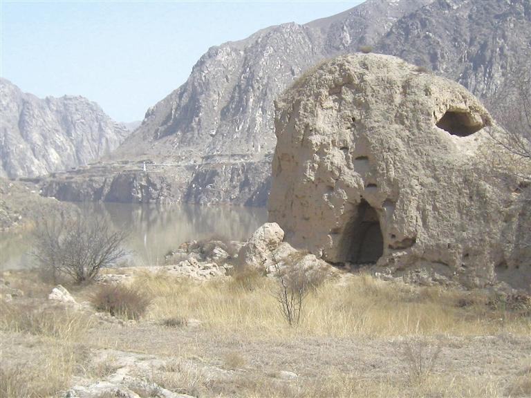 東坪向東300米,就是榆中境內(nèi)唯一遺留的一處漢長城遺址,該遺址現(xiàn)只有一處墻墩,緊鄰黃河,圍長40 余米,高約5米,無任何防護措施,墻壁上,有磚、石混雜其中,人工夯筑之痕清晰可辨。西側(cè)墻面上,還有人掏挖的小窯洞。高1.3米,深達50厘米。破壞嚴(yán)重。漢長城遺址再向東200米,東金公路向右拐入七峴溝,向來紫堡川而去,而黃河則被東面的大山阻擋,無路可去,左拐北折而流向什川。此處就是著名的黃河大“幾”字灣的第一灣。第一灣的南岸,有十來戶人家,地名叫駱圈灣。由于地處古絲綢之路,曾建有駱駝圈和小型客棧供駱駝客隊歇腳而又在黃河拐彎處而得名,后來,因諧音,叫羅泉灣。山腳下,有七八棵楊柳已吐綠。沿黃河,已無路可尋,就沿洪水沖的山溝上東山,還是無路,甚至沒有羊腸小道,巖石裸露,怪石嶙峋,坡陡難行。巖石層只有七八十米厚。此山的石頭,含有石英成分,石質(zhì)軟,無開采利用價值。再往上,就是黃土層,直到山頂。由于干旱,整個山上,無一棵樹木,甚至連灌木都沒有。耐堿耐旱的駱駝蓬只發(fā)出二厘米的枝蔓,一些蒿草和矮草,也剛發(fā)芽,還有一些匍匐在地面的無名小草,卻已開出了扁豆大小的艷麗的小花,有白色的和淡藍色的蝴蝶飛起飛落。爬到半山腰,太陽已全面照曬,山坡雖陡峭,卻無陰涼可乘。渾身發(fā)熱,不得不解開衣扣,緩慢前行。