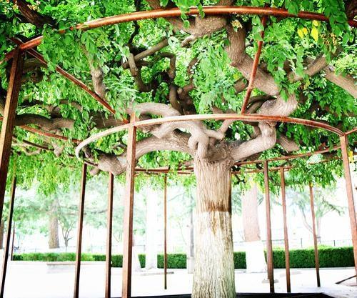 博物館里的這兩棵龍爪槐分別種植在展覽大樓前的東西兩角,是博物館的老專家郭維屏先生所種植。1959年秋冬,甘肅省博物館從通渭路舊館搬遷到七里河的新館,新館內(nèi)一片荒涼,亟待綠化。而就在此時(shí),郭維屏老先生調(diào)入博物館工作,參與到館內(nèi)的綠植規(guī)劃建設(shè),也正好發(fā)揮自己的藝術(shù)特長。這兩棵龍爪槐的幼株是郭老先生從五泉山苗圃選購的,栽種到展覽大樓前院的東西兩角,槐樹的周圍還設(shè)計(jì)了幾個(gè)形狀不一的花壇,花壇內(nèi)種植了各色各樣的樹木,一眼望去郁郁蔥蔥,生機(jī)盎然,頗有些韻味。這兩棵龍爪槐剛栽種時(shí)體型嬌小,看起來很不起眼。經(jīng)過郭老先生和博物館幾代人的悉心栽培,如今已是樹冠優(yōu)美,花香四溢。每到槐花盛開的時(shí)候,滿庭飄香,沁人心扉,成了博物館里一道靚麗的景色,引得路人駐足欣賞。東角的龍爪槐高約2米,樹干粗達(dá)2尺多,樹冠如傘,頂端長出八、九個(gè)主枝向四面伸展,屈曲盤繞,而后又分為數(shù)十個(gè)中枝和數(shù)百個(gè)小枝,互相攀援,屈折如爪,一枝獨(dú)秀。而西角的龍爪槐因基建的原因長勢受到一定影響。