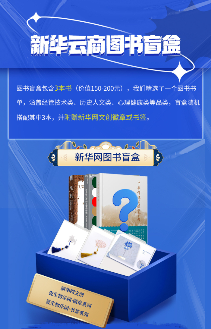 本次活動由新華云商聯合機械工業(yè)出版社、中國科學技術出版社、光塵文化、湛廬文化共同推出。盲盒內圖書涵蓋經管技術類、歷史人文類、心理健康類等品類,將隨機搭配三本,可能與您的藏書重復,或不符合您的閱讀愛好,請您慎重選擇理性購買。同時,盲盒內會附贈新華網文創(chuàng)徽章或書簽。