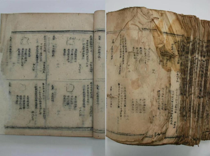 2021年,安徽省圖書(shū)館修復(fù)的徽州休寧《魚(yú)鱗圖冊(cè)》(明萬(wàn)歷木活字印本)修復(fù)前后對(duì)比圖。(安徽省圖書(shū)館供圖)