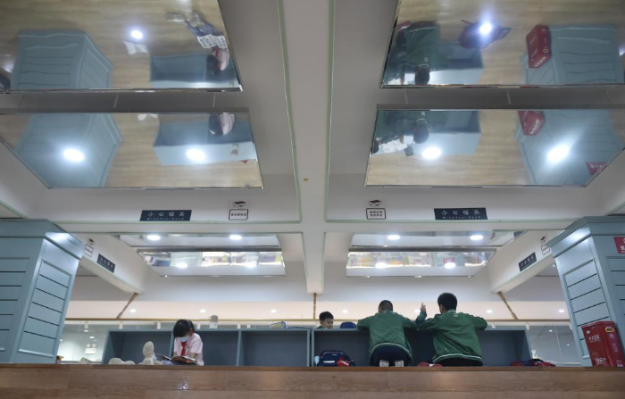 10月18日,小學生在鄭州市緯五路第一小學校園閱讀中心內閱讀。