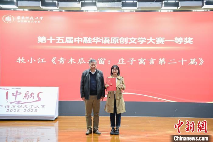 第十五屆中融華語(yǔ)原創(chuàng)文學(xué)大賽一等獎(jiǎng)獲得者朱禹同(筆名牧小江)從孫甘露手中接過獎(jiǎng)狀、獎(jiǎng)杯。(華東師范大學(xué)供圖)