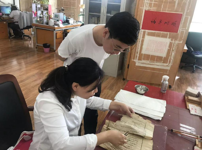 “古籍修復(fù)容不得任何失誤。每一道工序都要小心翼翼、屏息凝神。”王斌說,每拿到一本古籍,修復(fù)師首先要查看并記錄破損情況,同時制定修復(fù)方案,再根據(jù)方案對古籍進(jìn)行清洗、配紙、修補(bǔ)、錘平、修剪、壓實(shí)、裝訂……整個過程前后有幾十道繁瑣工序。