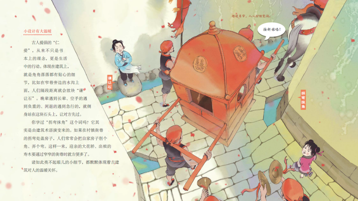書中提到了在墻面削個角、弄個彎,“拐彎抹角”、方便大家行走的謙讓智慧;齊心協(xié)力,共同出資出力蓋房子的和諧智慧;技術和藝術并存,用榫卯聯(lián)結構件的建構智慧;防患于未然,保證人們生命、生活安全的防患智慧……