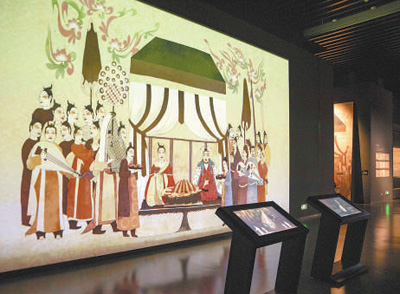 徐顯秀墓北壁壁畫《宴飲圖》互動投影墻。人民網記者 王 帆攝