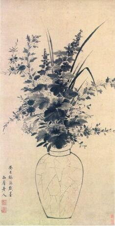 清初畫(huà)家王時(shí)敏的《端午景圖》《端陽(yáng)墨花圖》,將艾草、蜀葵、柳條、石榴花等時(shí)令花草引入畫(huà)中,寄予驅(qū)邪納福的寓意。畫(huà)中所寫(xiě)花草濃墨與淡墨相間,層次分明,體現(xiàn)出駕馭水墨的嫻熟技藝。值得一提的是,《端午景圖》中的瓷瓶為帶冰裂紋的豐肩斂腹瓶,這種將瓷器表面花紋如實(shí)描繪出來(lái)的現(xiàn)象,在古代花鳥(niǎo)畫(huà)中并不多見(jiàn),由此可見(jiàn)畫(huà)家獨(dú)特的筆墨趣味。