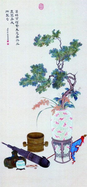 清代汪承霈繪《百福繁生圖》,柏樹(shù)、蝙蝠、幡旗和笙組合為“百福繁生”。