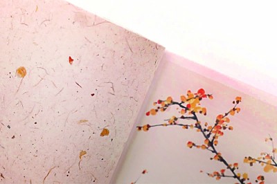 低首聞香,竹葉紙、桂花紙、蠟梅紙散發(fā)著獨(dú)有清香,在花葉紙上還能夠觸摸到真實(shí)的植物肌理;荸薺紙、無(wú)患子紙等果實(shí)紙上融入了肉眼可見(jiàn)的顆顆果粒;蜀葵紙、黃山欒紙、柿子紙等植物染色紙色彩繽紛,浸染著植物的天然原色;水印紙薄如蟬翼,透光可見(jiàn)植物圖案……摩挲間,24種花草紙有著獨(dú)屬于不同時(shí)節(jié)的味道,自然之美,蘊(yùn)蓄其中。