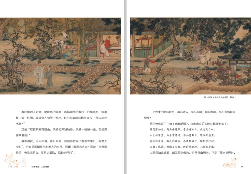 值得一提的事,這本書(shū)有很多稀見(jiàn)的插圖。比如讀到司馬相如的時(shí)候,配有明代仇英的《上林圖》;比如說(shuō)曹植,所用的顧愷之《洛神賦圖》也是根據(jù)曹植傳世名篇《洛神賦》而來(lái);寫(xiě)白居易則是用謝環(huán)的《香山九長(zhǎng)老圖》。