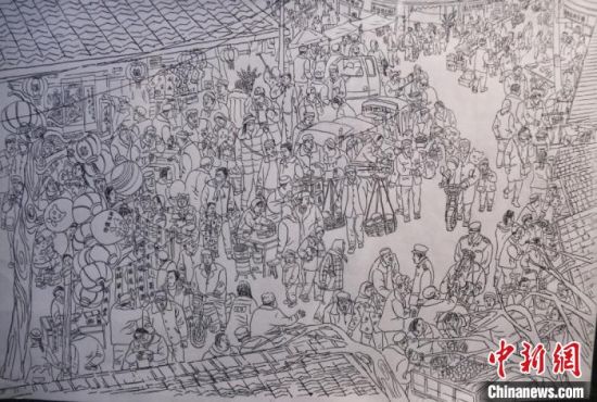 蘭州鋼筆畫(huà)愛(ài)好者周新平勾勒了數(shù)組關(guān)于鄉(xiāng)村記憶的鋼筆畫(huà),其中,《隴西臘月圖》是他歷時(shí)三個(gè)多月,手繪了200多村民,完成的一幅舊時(shí)農(nóng)民過(guò)年趕集的熱鬧圖景:賣(mài)糖葫蘆的小販、剪紙賀春的手藝人、趕車(chē)挑擔(dān)的趕集人……周新平說(shuō),他很怕“集市文化”將來(lái)被人們遺忘,用鋼筆記錄下來(lái),留住記憶里的“年味”以感悟鄉(xiāng)愁。