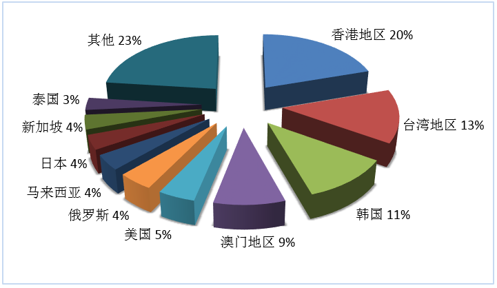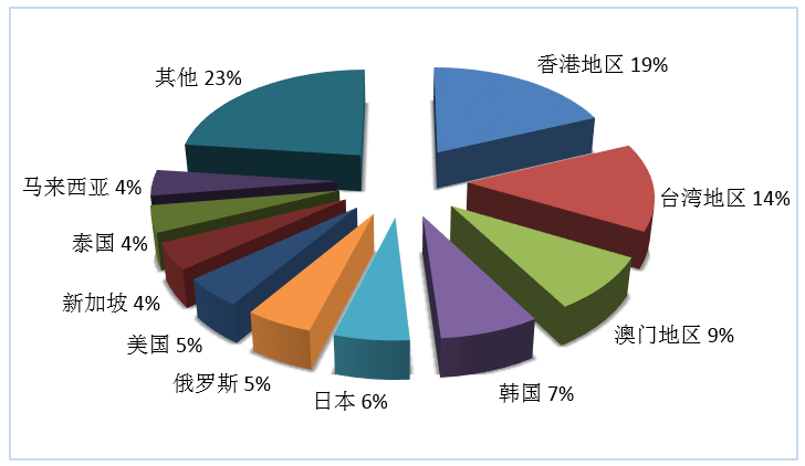 第三季度旅行社入境旅游接待人次排名前十位的客源地國(guó)家或地區(qū)由高到低依次為香港地區(qū)、臺(tái)灣地區(qū)、韓國(guó)、澳門(mén)地區(qū)、美國(guó)、俄羅斯、馬來(lái)西亞、日本、新加坡、泰國(guó)(見(jiàn)圖2)。