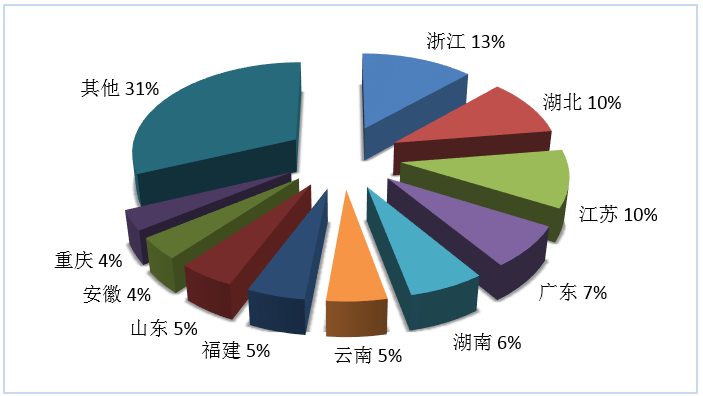 第三季度旅行社國(guó)內(nèi)旅游接待人次排名前十位的地區(qū)由高到低依次為浙江、湖北、江蘇、廣東、湖南、云南、福建、山東、安徽、重慶(見(jiàn)圖4)。
