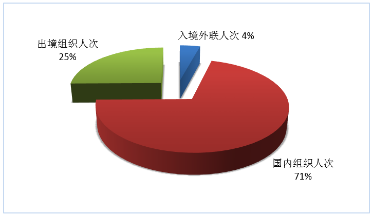 按照入境外聯(lián)人次、國(guó)內(nèi)組織人次、出境組織人次三項(xiàng)指標(biāo),入境旅游、國(guó)內(nèi)旅游、出境旅游市場(chǎng)人次所占份額依次為4%、71%和25%(見(jiàn)圖6)。