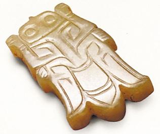 1987年,文物工作者從金塔縣金塔鄉(xiāng)五星村采集到一件琥珀雕對(duì)鳥(niǎo)紋佩飾,長(zhǎng)4.5厘米,寬5.8厘米。色橙黃,表面泛白。呈連體交頸對(duì)啄的雙鳥(niǎo)形。鳥(niǎo)體扁圓,像一對(duì)合體的豆莢。雙目如珠,啄喙尖長(zhǎng),相接相吻。二鳥(niǎo)雙喙處有三角形穿孔,鳥(niǎo)身中下部也有一橫孔,可隨機(jī)穿系佩掛。這件佩飾形態(tài)別致,雕技巧妙,玲瓏美觀?,F(xiàn)藏金塔縣博物館。