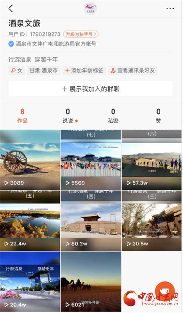 收到通知后,酒泉市文體廣電和旅游局按照省文旅廳要求,迅速開通“酒泉文旅”快手官方賬號,申請注冊了縣(市、區(qū))文旅局、4A級以上景區(qū)、縣(市、區(qū))博物館21家快手大V官方政務(wù)號,推薦上報33位熟悉網(wǎng)絡(luò)傳播規(guī)律、形象素質(zhì)較好的導(dǎo)游、講解員快手大V,組織建立了酒泉文旅快手大V培養(yǎng)隊伍。組織參加省文旅廳開展的線上“甘肅文旅快手大V培訓(xùn)”,讓更多的景區(qū)景點和博物館的導(dǎo)游、講解員參與其中,把快手平臺作為網(wǎng)絡(luò)宣傳主陣地,積極對外宣傳推介酒泉豐富的文化旅游資源。