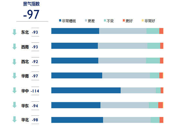《報告》稱,受疫情影響,全國各地對于旅游到訪目的地的景氣預(yù)期同樣極度消極,7大地區(qū)市場的平均景氣指數(shù)跌至-97。其中,受疫情影響最為嚴重的華中地區(qū)景氣指數(shù)最低。同樣的,目的地景氣指數(shù)也表現(xiàn)出疫情影響越嚴重,指數(shù)表現(xiàn)越低的趨勢。