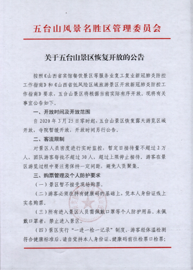 五臺山風景名勝區(qū)管理委員會對外宣布,自2020年3月25日零時起,山西五臺山風景名勝區(qū)恢復(fù)露天游覽區(qū)域開放,寺院暫緩開放,開放時間另行公告。