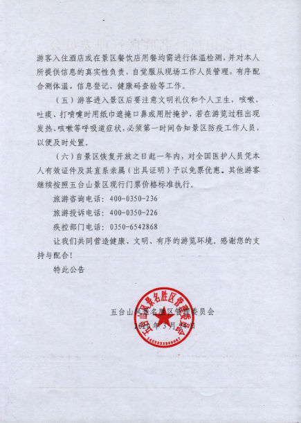 據(jù)悉,五臺山景區(qū)暫不接受現(xiàn)場購票,游客必須在持有健康碼的基礎(chǔ)上,憑本人身份證線上實名購票。所有進入景區(qū)人員需佩戴口罩等個人防護用品。未佩戴口罩者,禁止進入景區(qū)。游客經(jīng)體溫監(jiān)測符合健康標準后,需持本人身份證、健康碼前往檢票口檢票;游客入住酒店或在景區(qū)餐飲店用餐均需進行體溫監(jiān)測,并對本人所提供信息的真實性負責,自覺服從現(xiàn)場工作人員管理,有序配合測體溫、信息登記、健康碼查驗等工作。