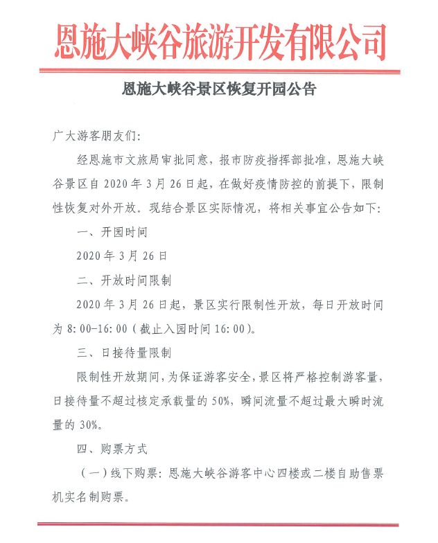 恩施大峽谷旅游開發(fā)有限公司今天發(fā)布《恩施大峽谷景區(qū)恢復(fù)開園公告》(以下簡稱《公告》),2020年3月26日起,恩施大峽谷景區(qū)恢復(fù)開園。值得注意的是,恩施大峽谷將實(shí)行限制性開放,每日開放時間為8:00-16:00(截止入園時間16:00)。