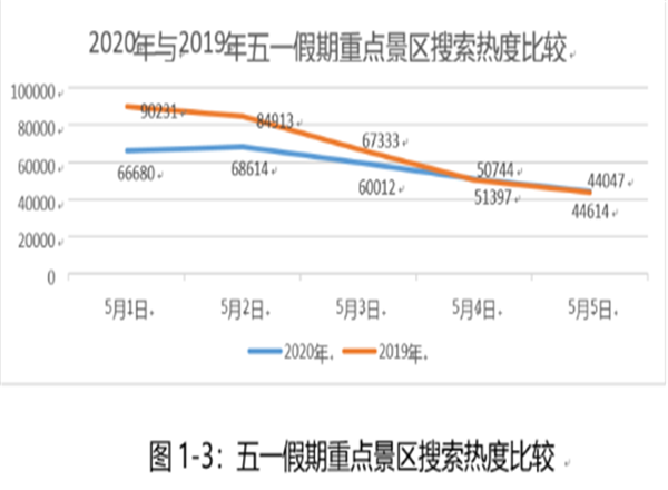 “五一”期間全省重點景區(qū)關(guān)鍵詞搜索熱度為29.1萬次,較去年同期33.7萬次下降13.6%。