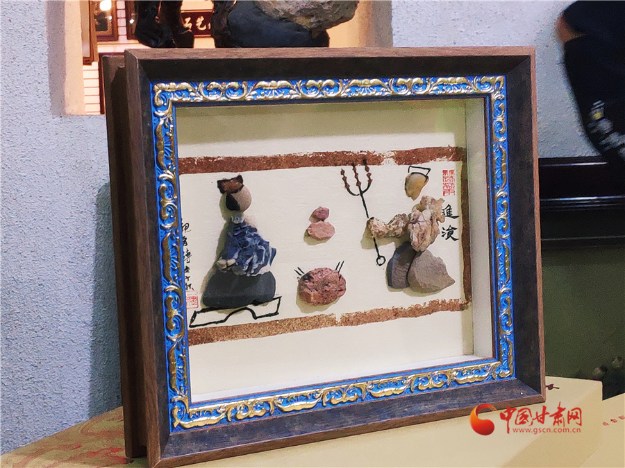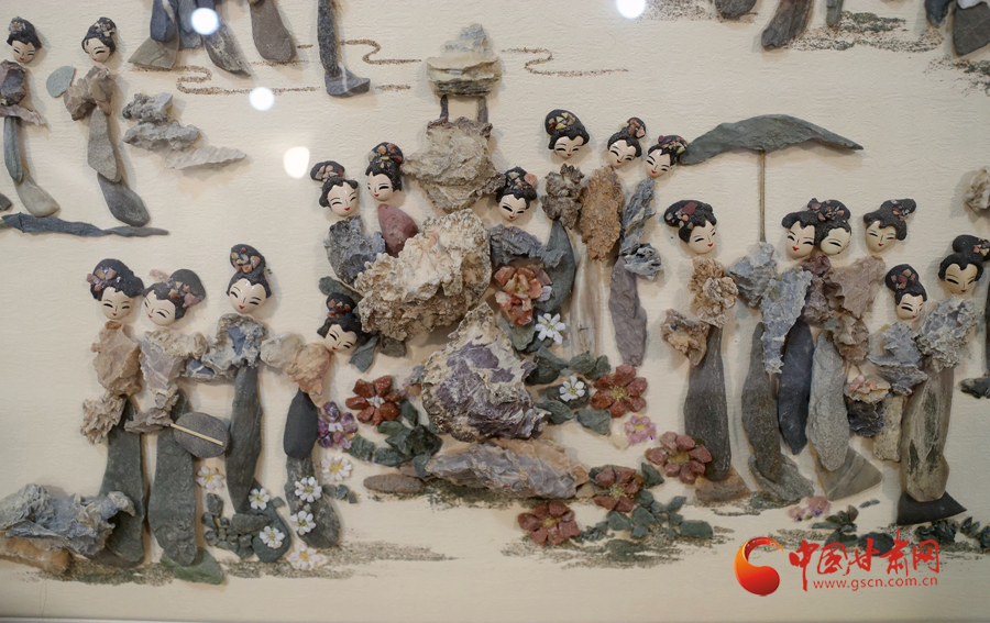 最近,周文露正在創(chuàng)作客戶定制的金陵十二釵圖,這幅風(fēng)雨雕除了人物面部經(jīng)過人為描繪加工,其他部位以及山水意境等都是戈壁沙石所做。很大程度上,這幅作品就是巧妙地將戈壁沙石創(chuàng)意堆砌達到畫面效果。