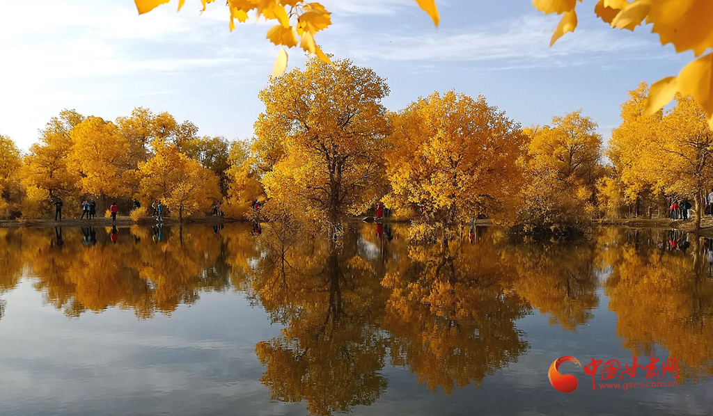 10月10日,在甘肅省酒泉市金塔沙漠胡楊林景區(qū),胡楊林在陽光的照耀下金黃燦爛,與湖水相映,令人流連忘返。(無人機照片)