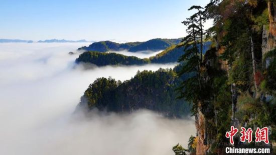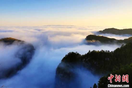10月上旬,甘肅省定西市漳縣貴清山國家森林公園,朝陽在云層中若隱若現(xiàn),云遮霧繞的景象讓層巒疊嶂的山峰成為“云端村落”,仿若仙境。漳縣貴清山國家森林公園境內(nèi)原始森林遍布,森林、動植物資源十分豐富,貴清山被譽(yù)為隴中的“小華山”,是生態(tài)旅游勝地。