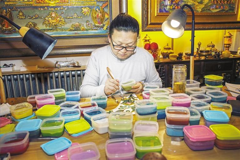 據(jù)李海明介紹,近年來,經(jīng)常會受邀代表甘肅省文創(chuàng)去省外參展,而每次展出的琺瑯文創(chuàng)產(chǎn)品都會受到來自各地的年輕人的好評。“有時會把不同人創(chuàng)作的壁畫、唐卡等擺在一起展出,總有很多年輕人在我的作品前逗留良久,這說明他們對我的琺瑯釉色彩是非常認(rèn)可的。”