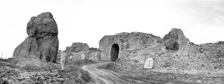 在鄉(xiāng)村公路邊,有人工擺放的怪石,上面有各種字體的書法石刻。這是山丹縣傾力打造的中國西部長城文化書法石刻長廊的一部分,這個(gè)石刻長廊工程陳列了600多方名家書法石刻,到峽口古城前還有模擬太極八卦圖的展示……