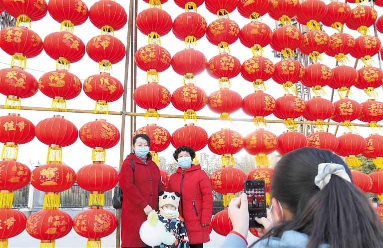 春節(jié)臨近,臨夏市街道、社區(qū)、公園張燈結(jié)彩,處處呈現(xiàn)一派喜慶祥和的節(jié)日氣氛。圖為市民們?cè)跂|郊公園紅燈籠前拍照。 記者 史有東 攝