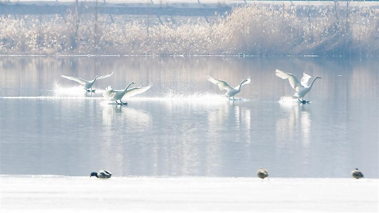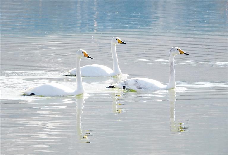 近日,永靖縣鹽鍋峽鎮(zhèn)境內(nèi)的黃河八盤峽水庫(kù)成為天鵝等候鳥越冬的樂園,它們?cè)诖藯?、覓食,成為冬日黃河里的一道靚麗風(fēng)景。 本報(bào)記者 史有東 攝