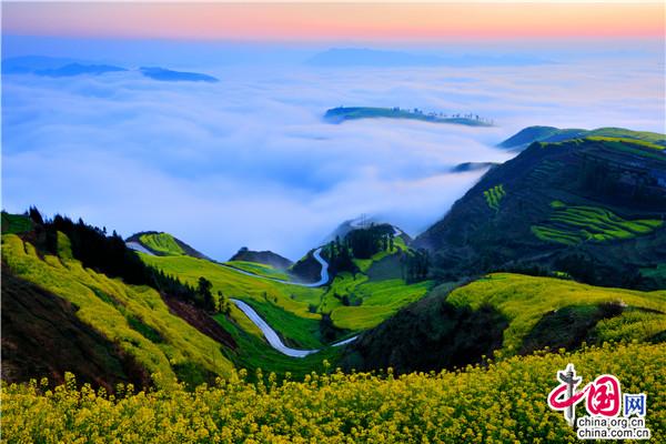 云南省羅平縣無處不風景。春季的馬街,桃花、梨花、李花、山茶花、油菜花、杜鵑花、馬纓花把一座座山峰映襯得如詩如畫。佇立牛頭山俯視云層,漫無邊際的白云在山麓翻滾、碰撞、擁擠,雖沒有海的蔚藍與呼嘯之態(tài),卻有海的浩瀚與壯闊。站在山巔呼吸沁人心脾的清新空氣,聽山風掠過林梢的聲音,云霧升騰時如夢如幻,仿佛有仙人騰云駕霧下凡而來。
