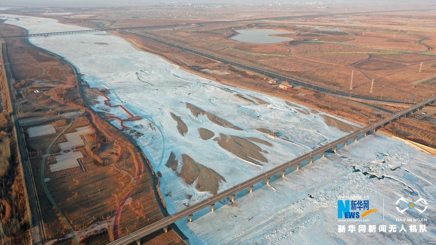 隆冬時(shí)節(jié),流經(jīng)甘肅省張掖市甘州區(qū)的黑河河水結(jié)冰,銀裝素裹,從空中俯瞰如一條白色飄帶蜿蜒。