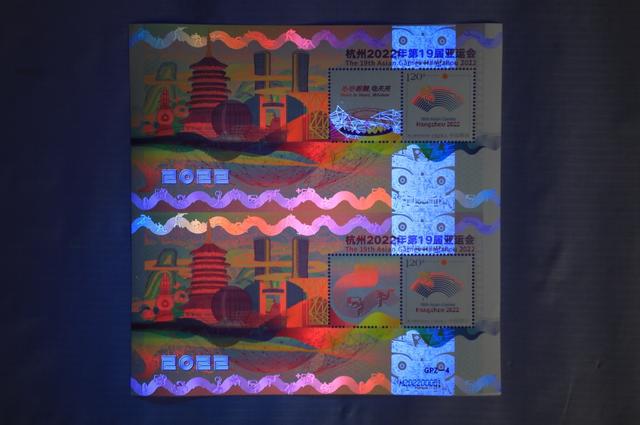 據(jù)了解,《杭州2022年第19屆亞運(yùn)會(huì)》特殊版式個(gè)性化郵票雙連張是中國(guó)集郵有限公司匠心打造的首款GPZ編號(hào)體育題材郵票,由青年設(shè)計(jì)師趙郁竹擔(dān)綱設(shè)計(jì),限量發(fā)行。它依托杭州亞運(yùn)會(huì)色彩系統(tǒng)和視覺(jué)形象元素,融歷史文化、現(xiàn)代美學(xué)和未來(lái)暢想于一體,集藝術(shù)感、科技感和運(yùn)動(dòng)感于一身,展現(xiàn)中華文明、浙江風(fēng)采、杭州韻味和時(shí)代魅力,采用特殊版式、編號(hào)和工藝,紫光燈下局部呈現(xiàn)無(wú)色熒光油墨圖案和全真彩效果,傳遞中國(guó)郵政對(duì)杭州亞運(yùn)的美好祝福。(圖片由人民日?qǐng)?bào)客戶端提供)