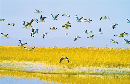 遷徙途中的白鷺在黨河峽谷蘆草灣濕地棲息。郭清